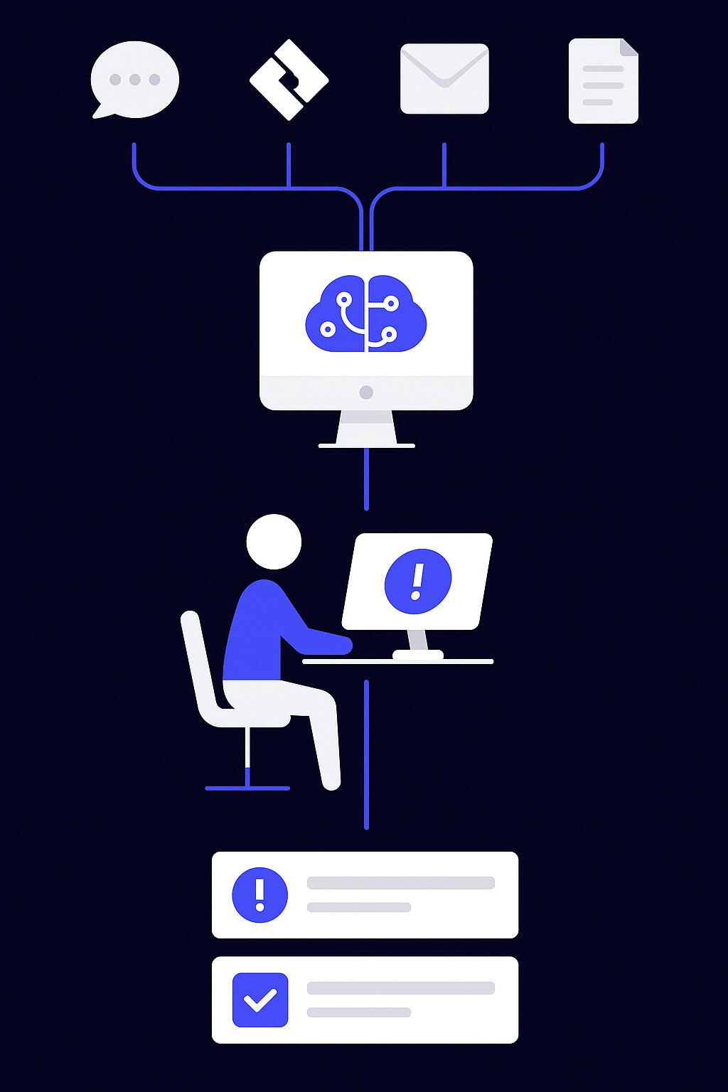 Pulls from Jira, meeting notes, transcripts, SOWs, and email threads to understand the real project pulse.